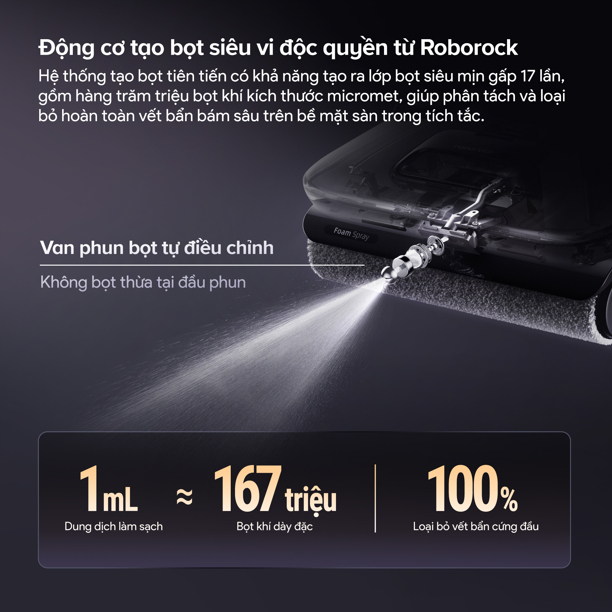 Bên trong Roborock F25 ACE Pro là động cơ Foam Smart có khả năng tạo ra bọt siêu vi mịn gấp 17 lần, đạt tới 1.67 tỷ hạt bọt chỉ với 1 ml dung dịch. Mỗi hạt bọt khi vỡ ra sẽ sinh ra năng lượng vi mô giúp tách vết bẩn khỏi bề mặt nhanh chóng. Cấu trúc phun với van điện từ tinh chỉnh đảm bảo không tồn đọng bọt ở đầu phun, giúp tiết kiệm dung dịch và duy trì hiệu quả phun ổn định.